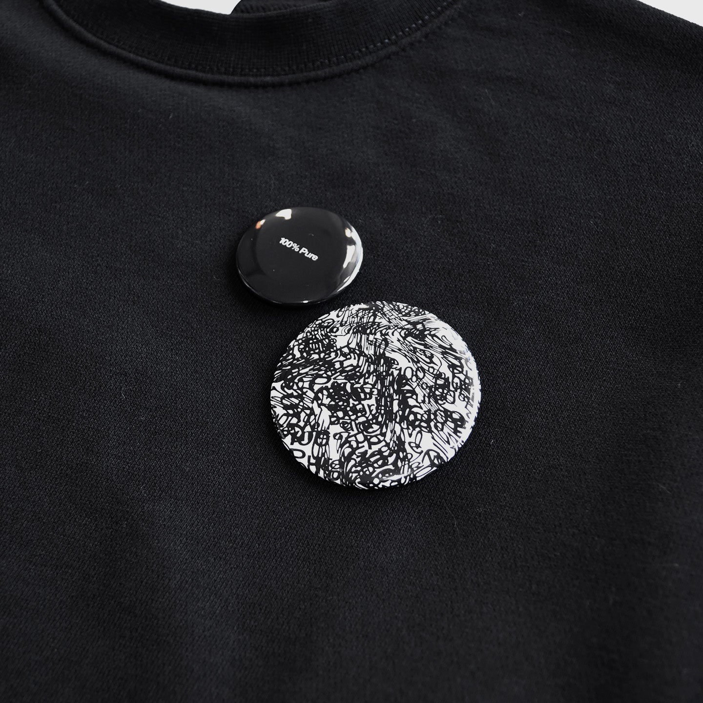 缶バッジやブローチ等でカスタムいただくことを前提とした、100% Pureなスウェットです。バックには、フロントをカスタムして着用の際に主張しすぎないグラフィックをプリントしました。100% Pureな缶バッジ×2付属。